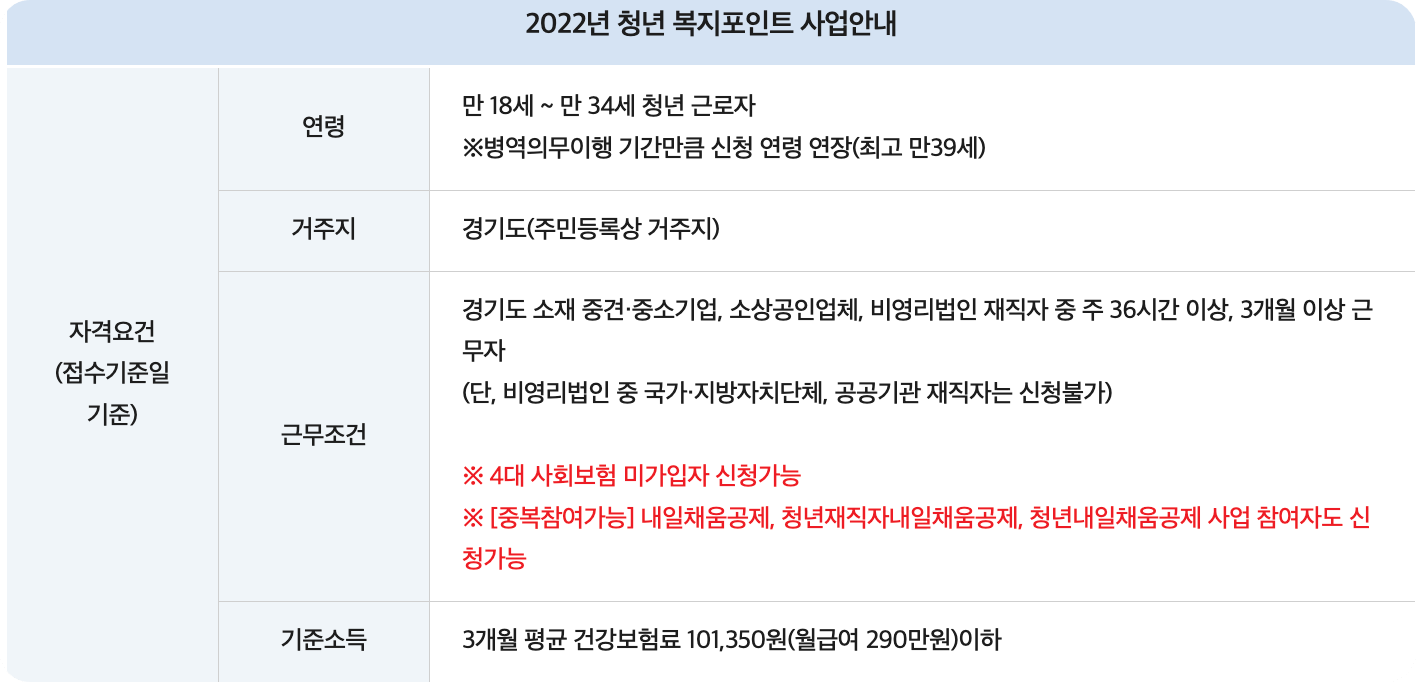 앞서 말씀드렸듯이 청년복지포인트를 신청하기 위한 자격은 그리 높은 편이 아닙니다.