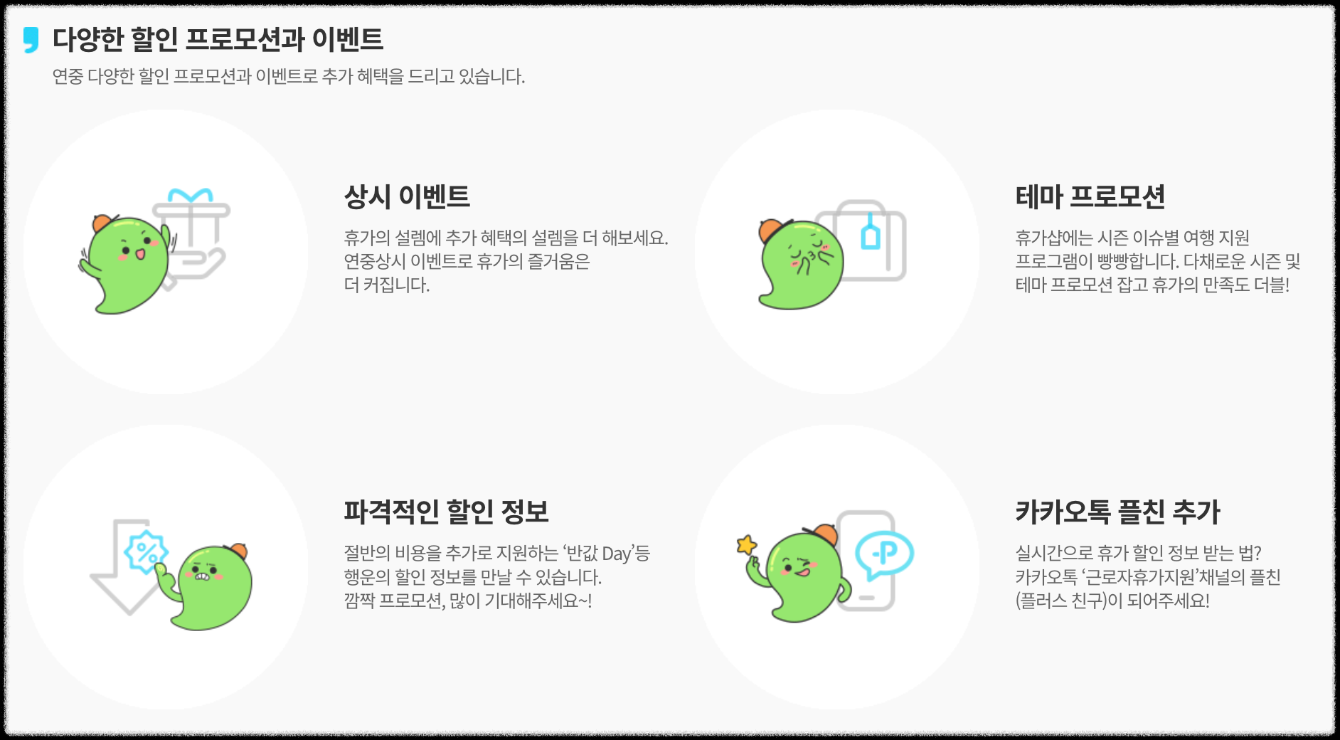 상시 이벤트, 테마 프로모션 등 우리의 알찬 휴가를 위해 여러가지 혜택들도 챙겨준다고 하니 정말 좋네요.