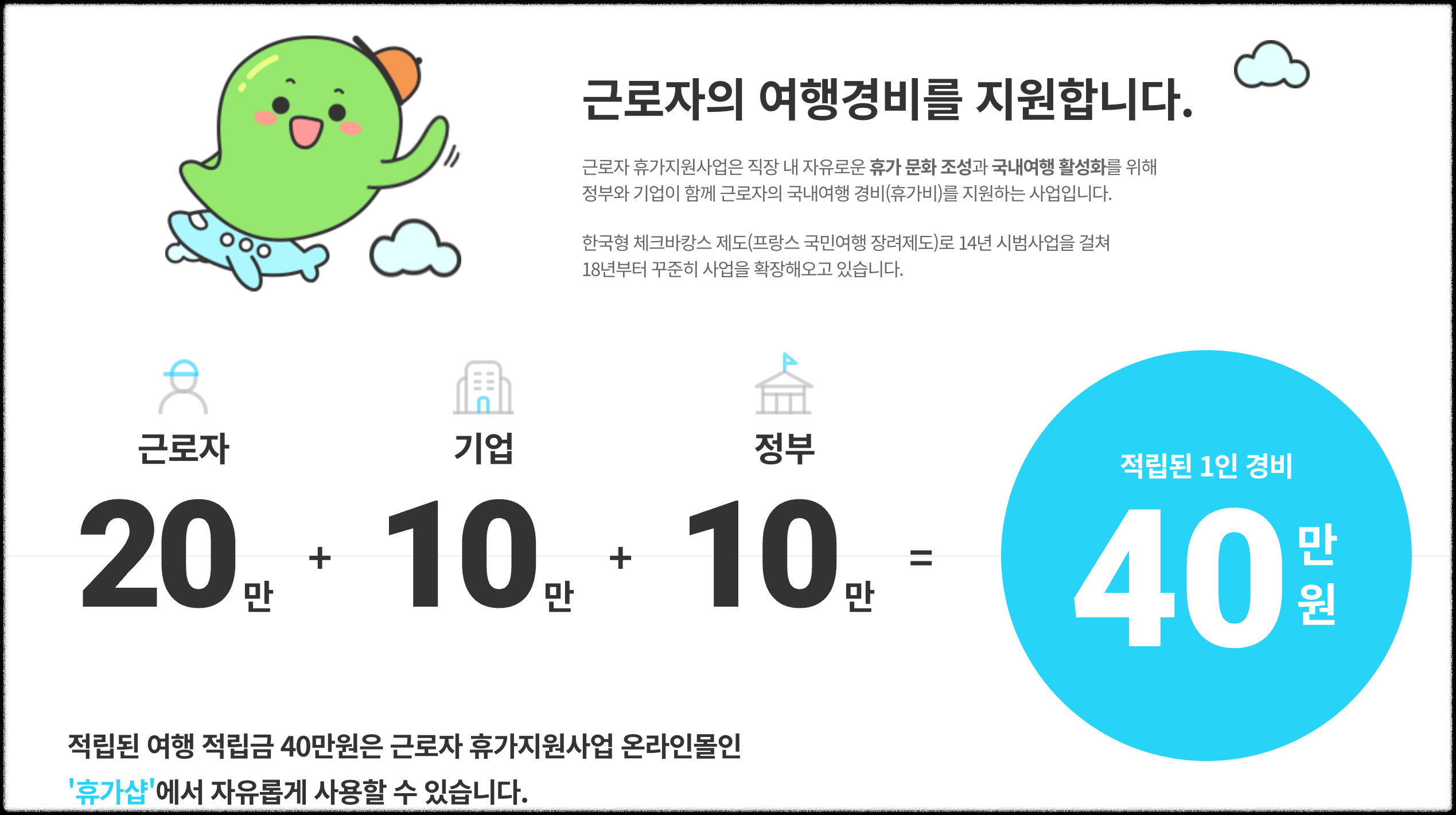 말그대로 직장 내 자유로운 휴가 문화 조성과 국내여행 활성화를 위해 정부와 기업이 함께 근로자의 국내여행 경비, 즉 휴가비를 지원하는 사업입니다.