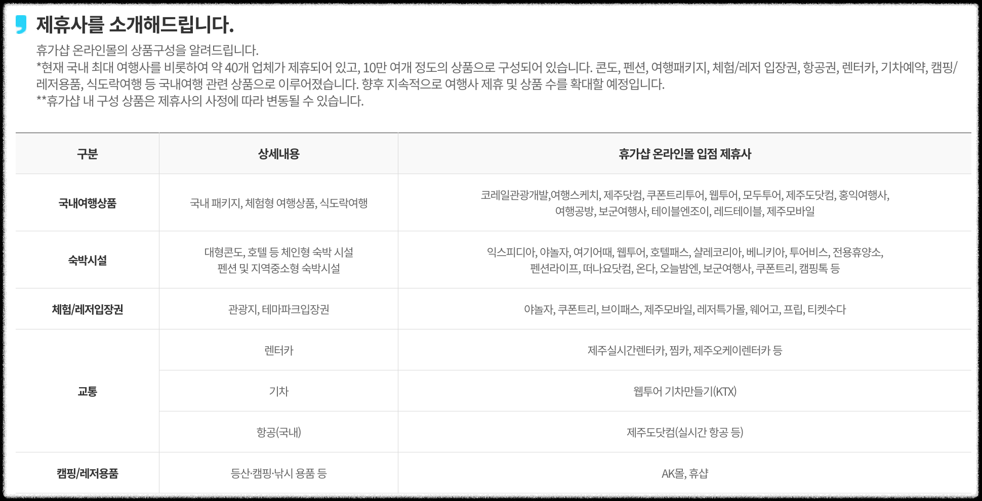 현재 국내 최대 여행사를 비롯해서 약 40개 업체가 제휴되어있고 상품의 가짓 수도 10만 여개에 이른다고 합니다.