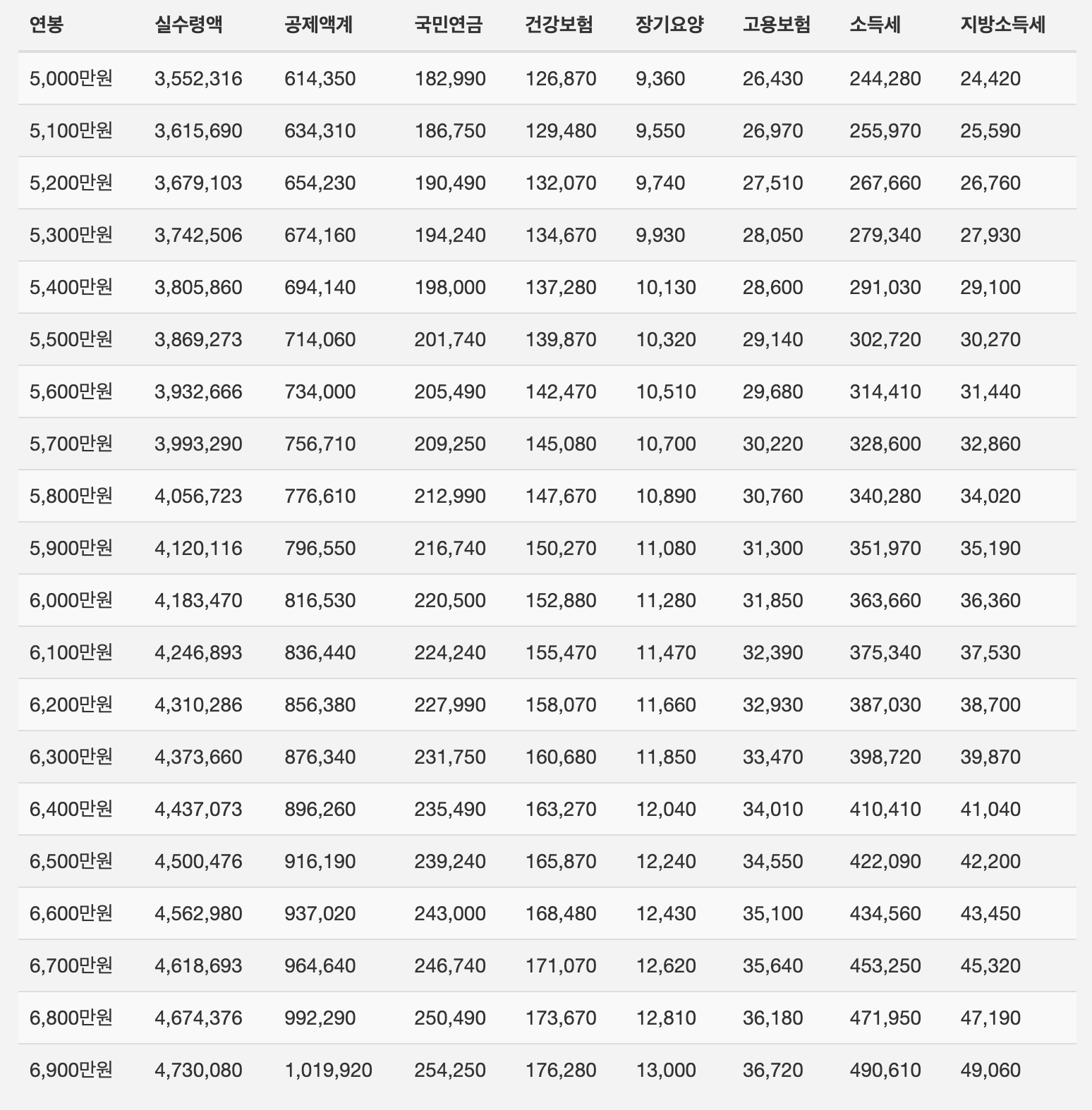 2022년도 연봉별 실수령액에서 보이는 것처럼
