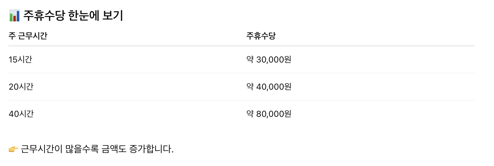 👉 주휴수당 = (주 근로시간 ÷ 40시간) × 8시간 × 시급