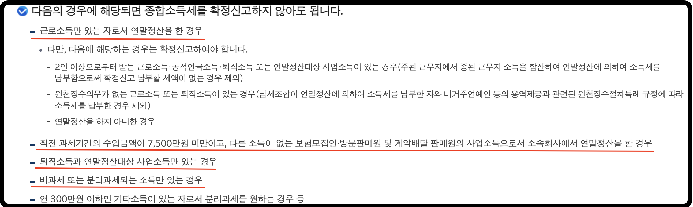 이렇게 약 5가지의 경우에는 종합소득세 신고를 하지 않아도 된다고 합니다.